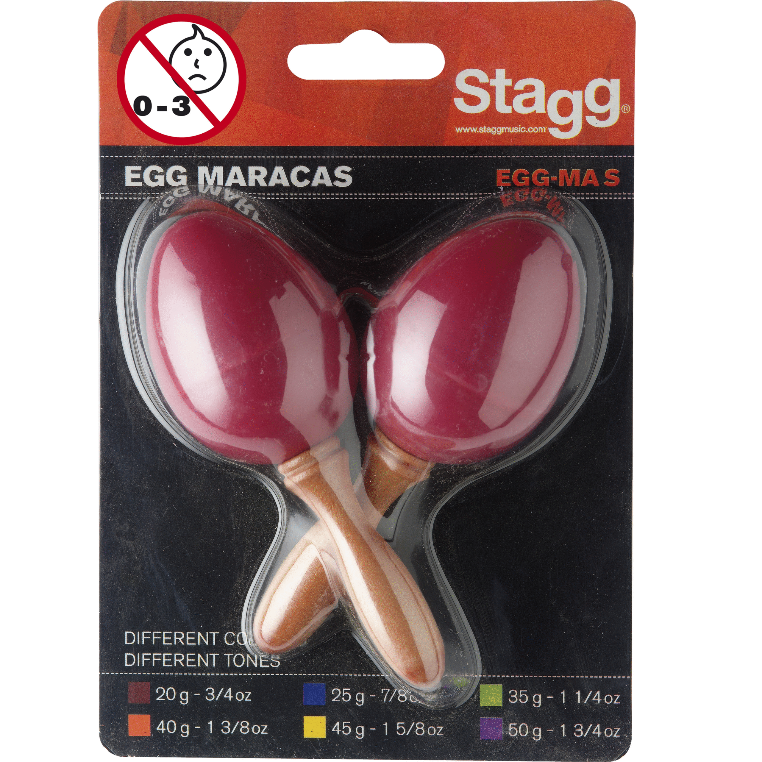 Las maracas Stagg EGGMASRD están hechas de plástico de alto impacto resistente a caídas y golpes. Tienen un mango de madera de 5cm, un peso de 20 gramos y una terminación en color rojo. Cada par tiene un peso diferente según su color.